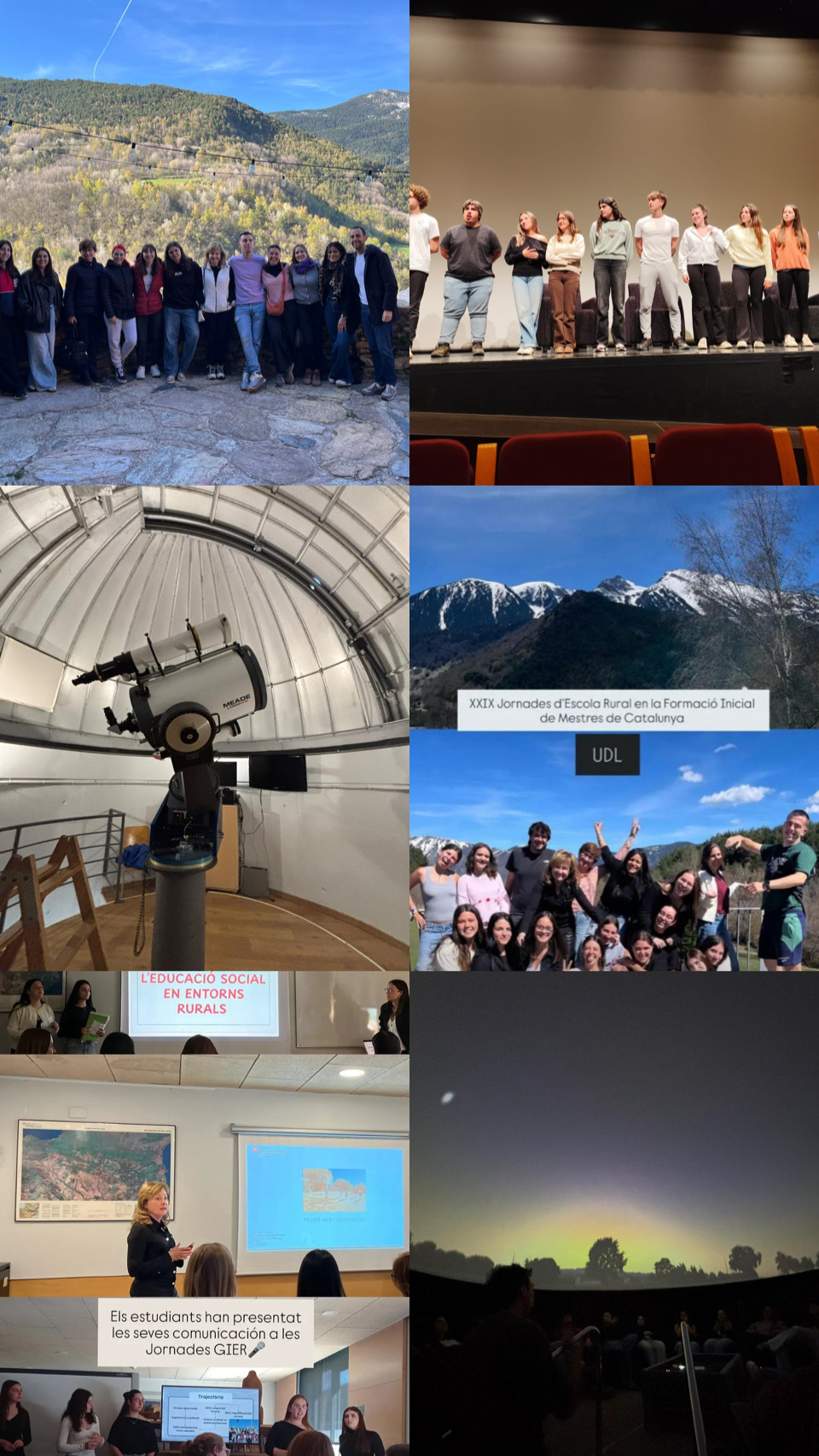 Al llarg de les jornades, l’alumnat ha presentat comunicacions que recullen experiències, mirades i aprenentatges vinculats a l’escola rural, generant relats pedagògics que connecten l’aula universitària amb la realitat dels pobles de muntanya. A més, han participat en diversos tallers metodològics —com La Maleta Fallaire, Educar en el Patrimoni dels Pirineus, Procés d’aprenentatge de l’escriptura a l’aula internivell o El Planetari: viatge a les galàxies— que han obert noves perspectives sobre la creativitat, el patrimoni i la ciència en contextos rurals.